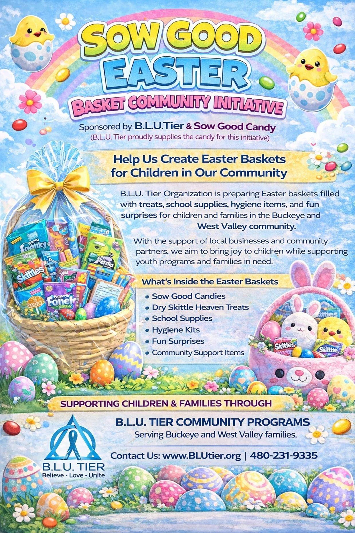 The Easter Basket Community Initiative is a community outreach program organized by B.L.U. Tier Organization (Believe. Love. Unite.) to provide Easter baskets filled with candy, hygiene items, school supplies, and small gifts for children and families in the Buckeye and West Valley communities.